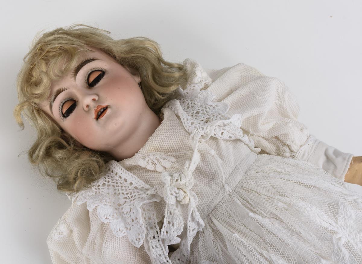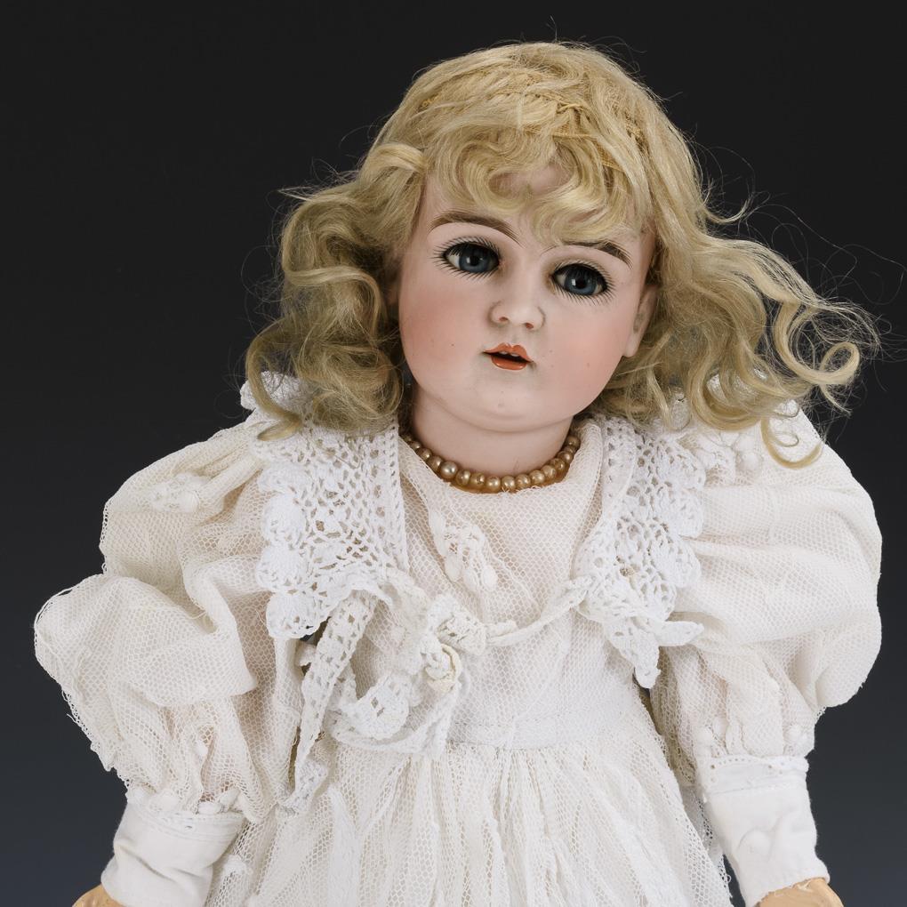 Kurbelkopf, blaue Schlafaugen mit Wimpern, blonde Mohairperücke. 15-teiliger Gliederkörper mit rotem "Excelsior"-Stempel. Jünger ergänztes Kleid, Perlenkette. Kopf durchleuchtet: kleiner Chip an der Halskurbel, Augen jünger ergänzt.