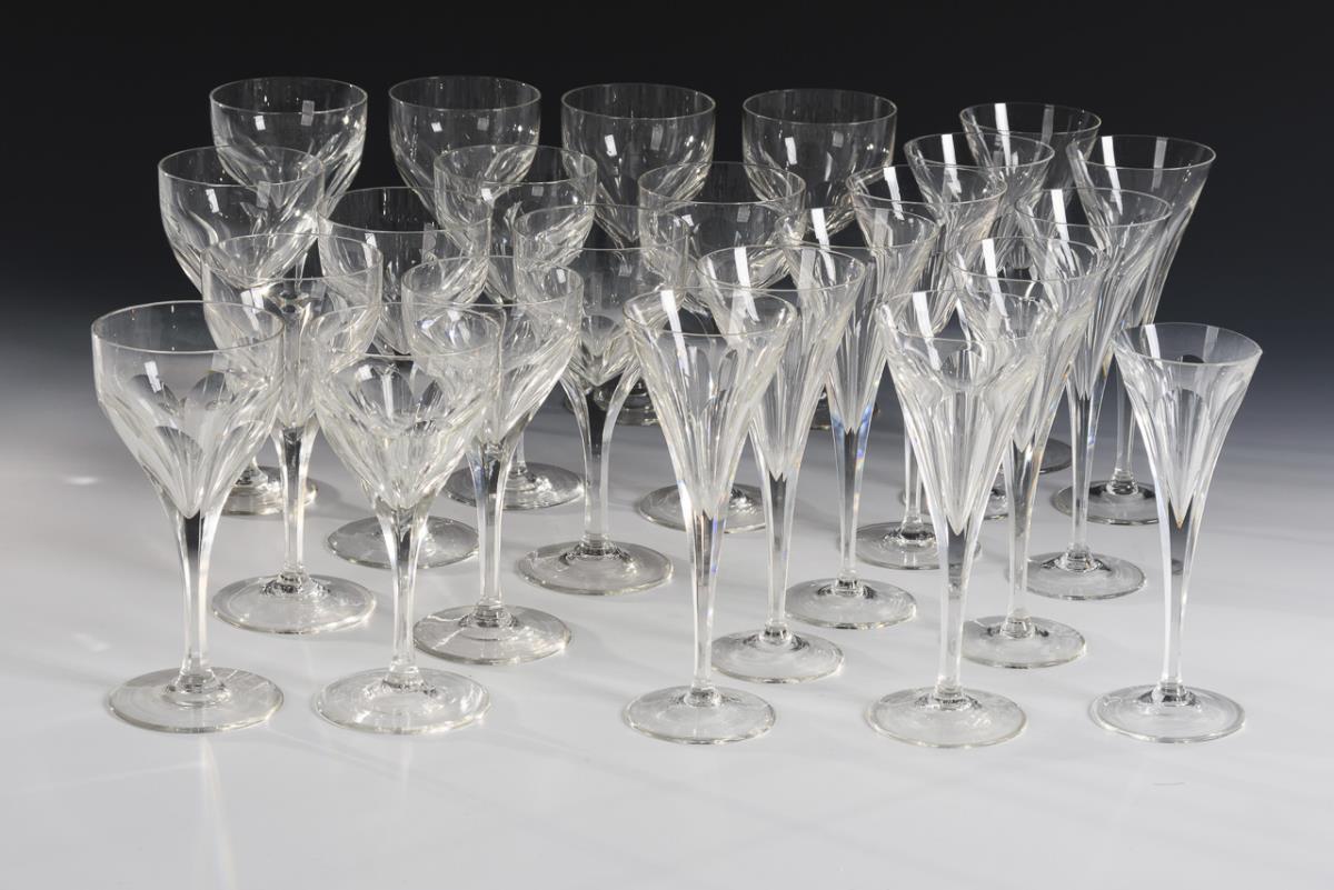 24 Teile. Gläser mit am Ansatz sechsfach facettierter, in den Stängel übergehender Kuppa und Rundfuß. Randbestoßung am Sherryglas, an 1 Sektglas und an 1 Weinglas.