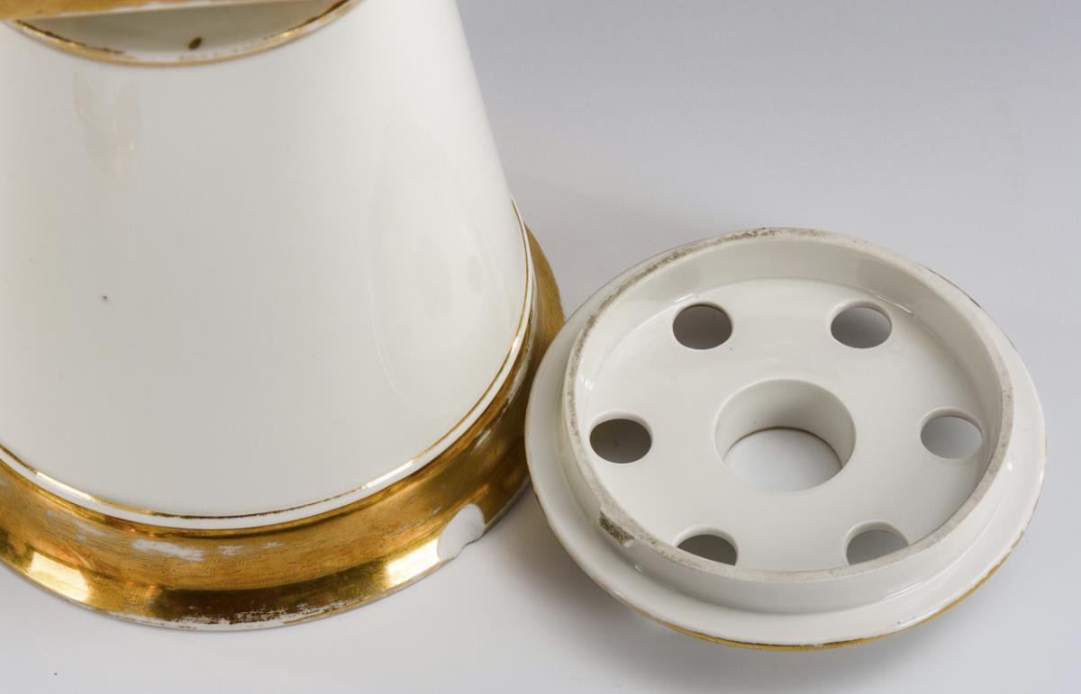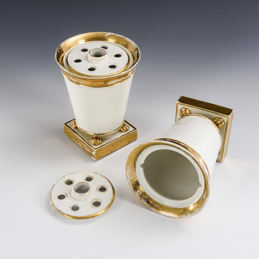 Konische Vasen mit vier Tatzenfüßen und durchbrochenem Deckel. 1 Deckelnase bestoßen, 2 Deckelnasen fehlen, Gold etwas berieben.