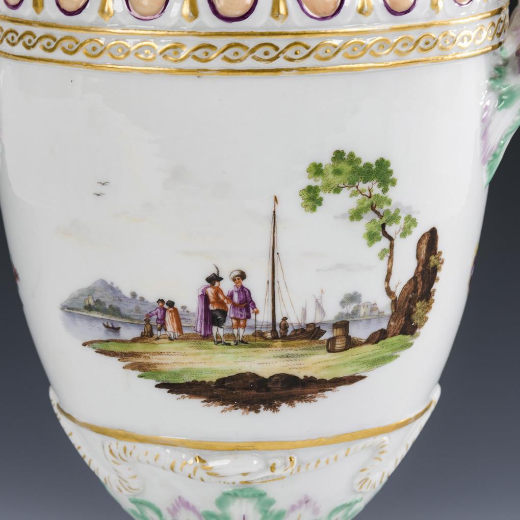 Ovoider Korpus mit Blatt- und Zungenbandrelief, zwei Henkeln, Knospenknaufdeckel und Rundfuß, auf kannelierter Plinthe. Beidseitig die Darstellung einer Hafenansicht mit Kaufleuten. Brandriss im Deckel innseitig (von außen nicht sichtbar), Korpusansatz restauriert, Knaufknospe minimal berieben.