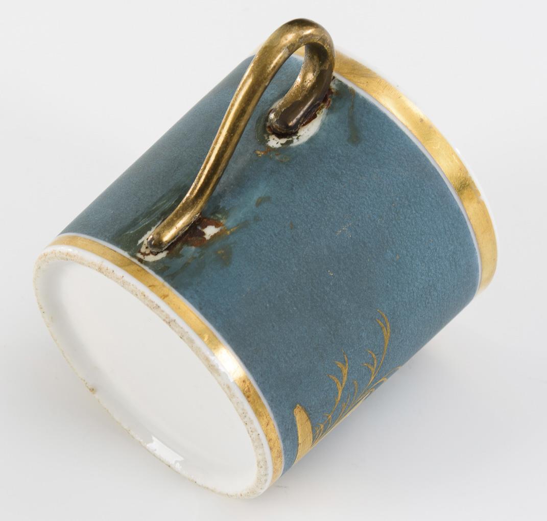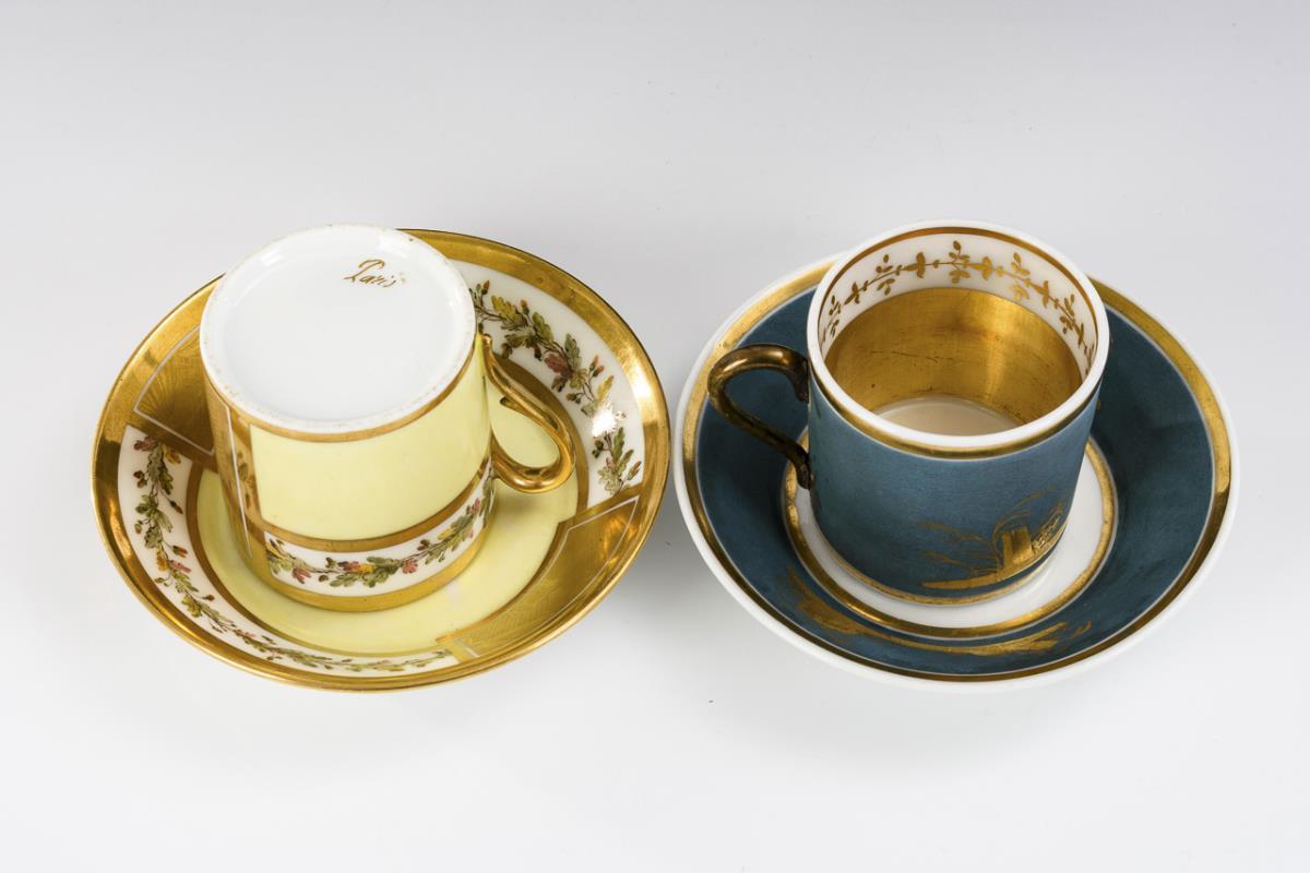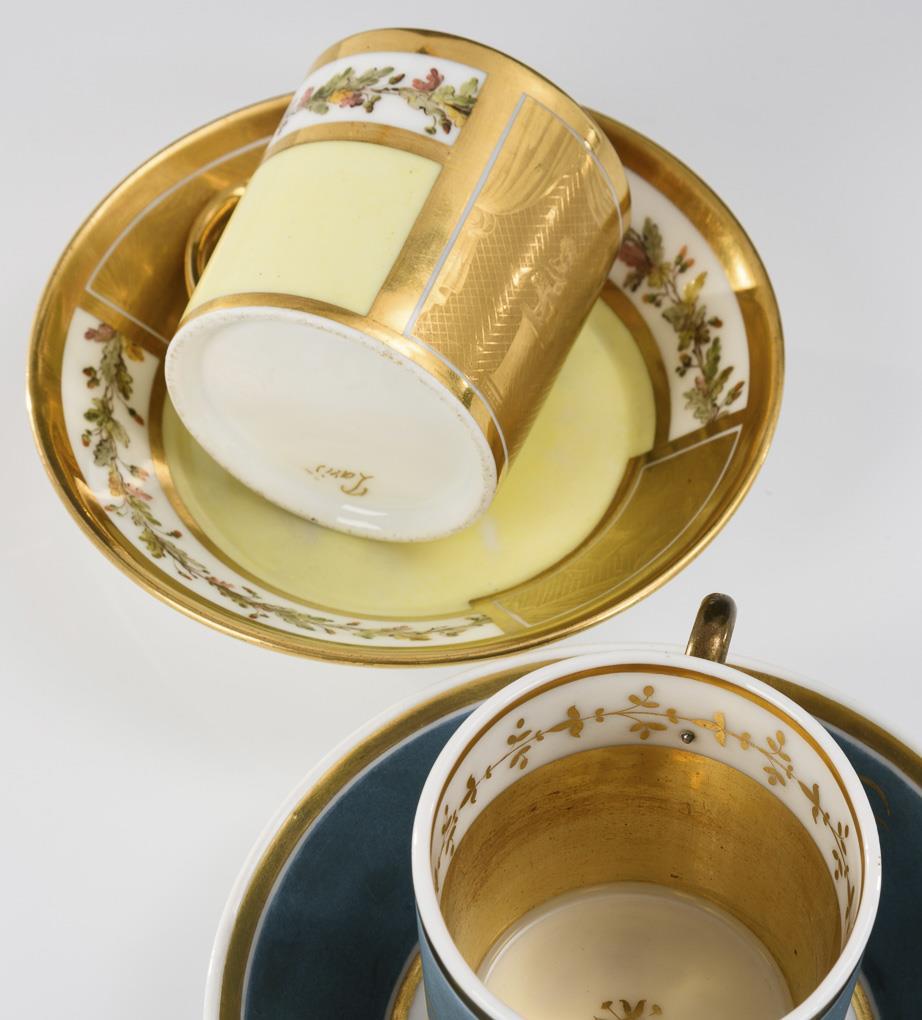 Zylindertassen mit Ohrenhenkeln. 1x mit zitronengelbem Teilfond, Eichenlaubbordüre und einer schauseitigen Rechteckkartusche mit der goldgravierten Darstellung eines Amors mit Lamm und Schalmei; innen vergoldet. / 1x mit mattblauem Fond und der goldgravierten Darstellung einer Landschaftsinsel mit Frau, Vogel und Gedenkstein. 1 Untertasse mit Haarrissspinne, 1 Henkel alt restauriert, 1x Untertassenspiegel etwas berieben.