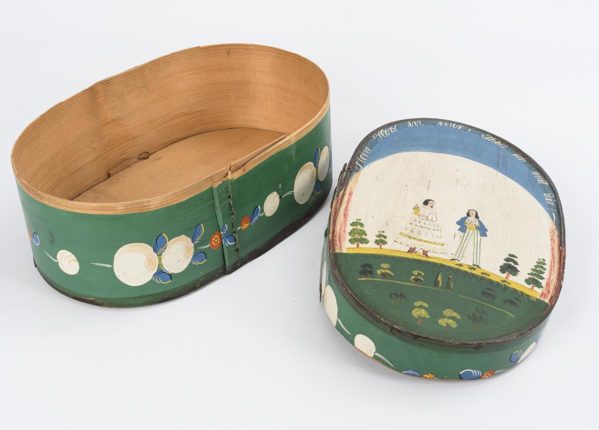 Spätbiedermeier-Spanschachtel mit Hochzeitsmotiv.