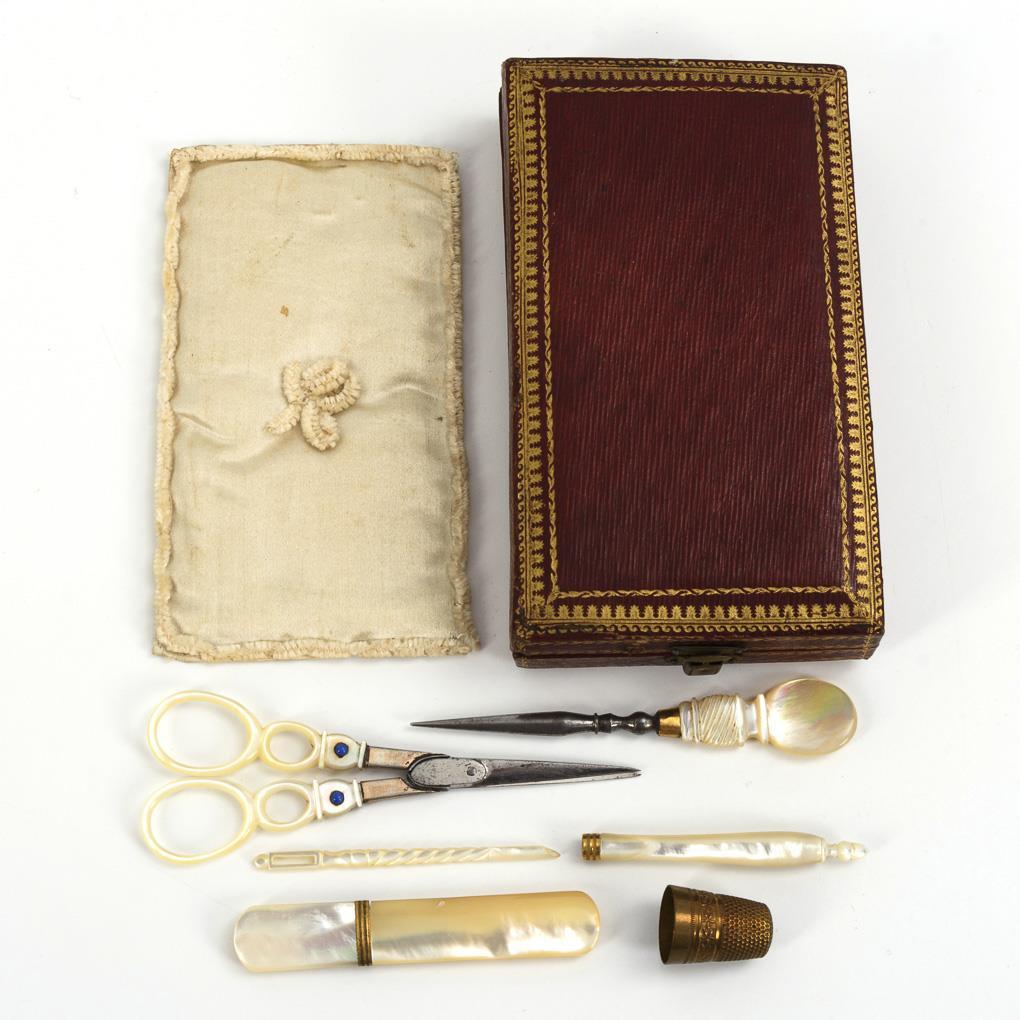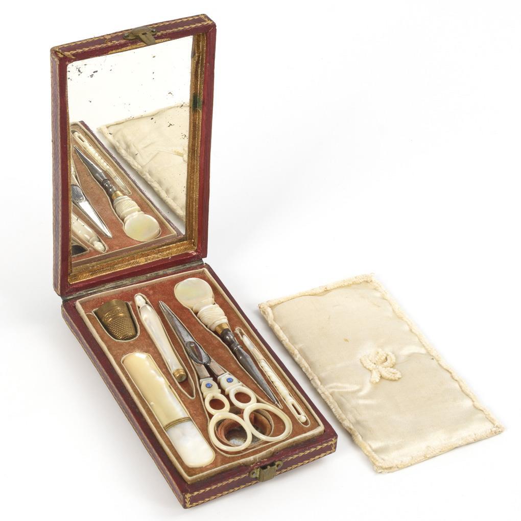 Quaderschatulle mit Goldprägung im roten Leder sowie Spiegel im Scharnierdeckel. Innen Ahle, Nadelbehälter, Schere usw. mit Perlmuttgriffen. Fingerhut ergänzt, Spitze Perlmuttnadel fehlt, einige wenige Alters-/Gebrauchsspuren.