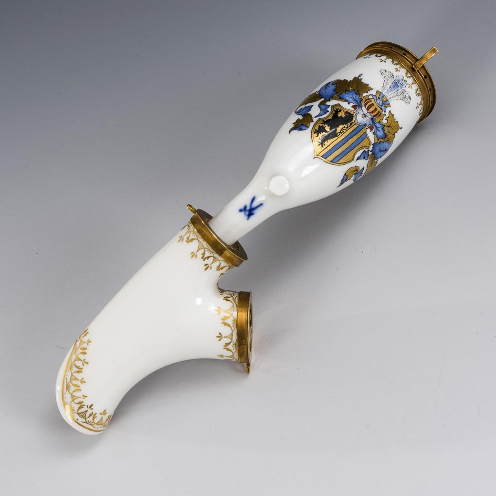 Pfeifenkopf mit Saftsack und Goldmontierungen (585/Meisterzeichen/Unikat gepunzt). Schauseitig das Wappen der Stadt Leipzig, verso die Bezeichnung "Leipzig 1713 erstmalig erscheint Meissner Porzellan als Handelsgut auf der Messe".