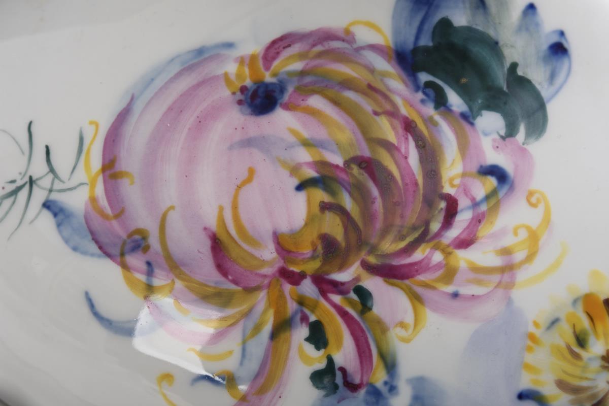 Unterglasurblaue Malerei, polychrome Aufglasurmalerei, Goldstaffage. H 25,5 cm, L 30,5 cm.