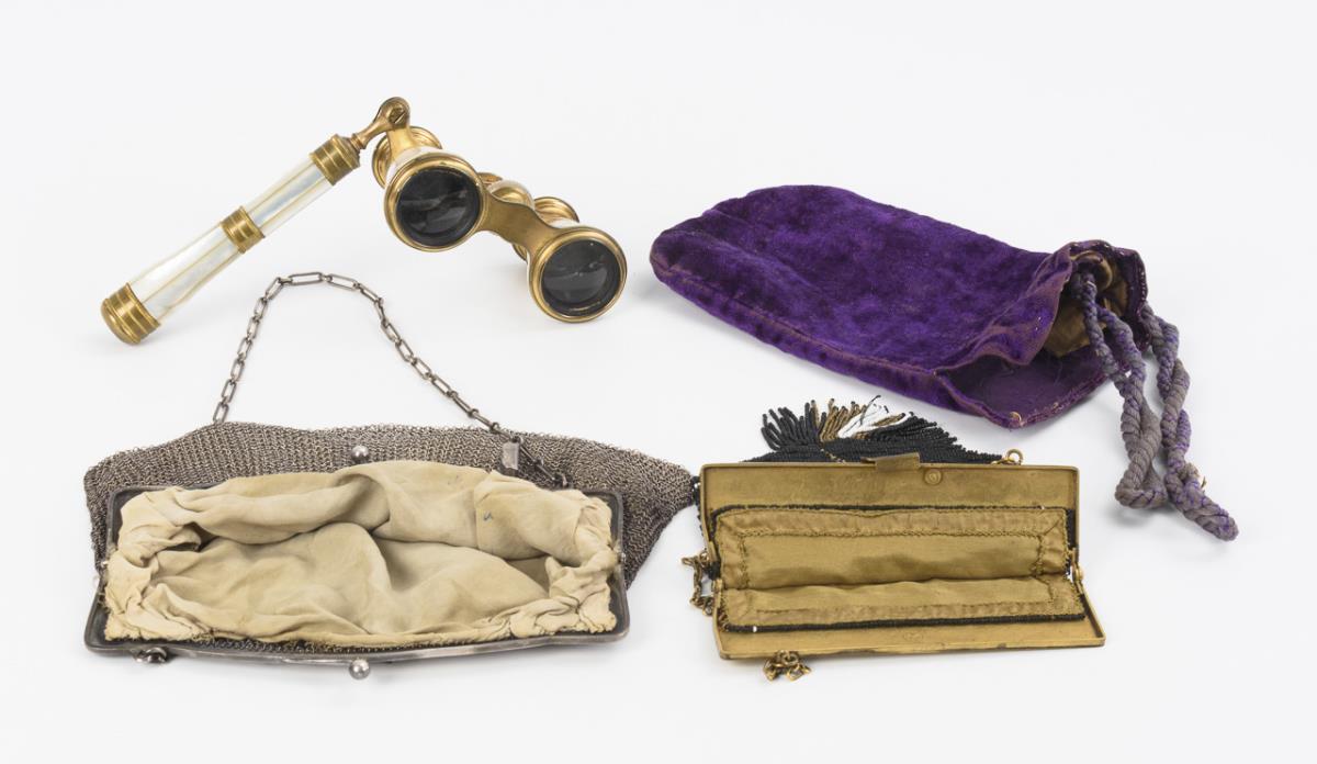 2 Theatertaschen, 1 Beutel und 1 Opernglas.