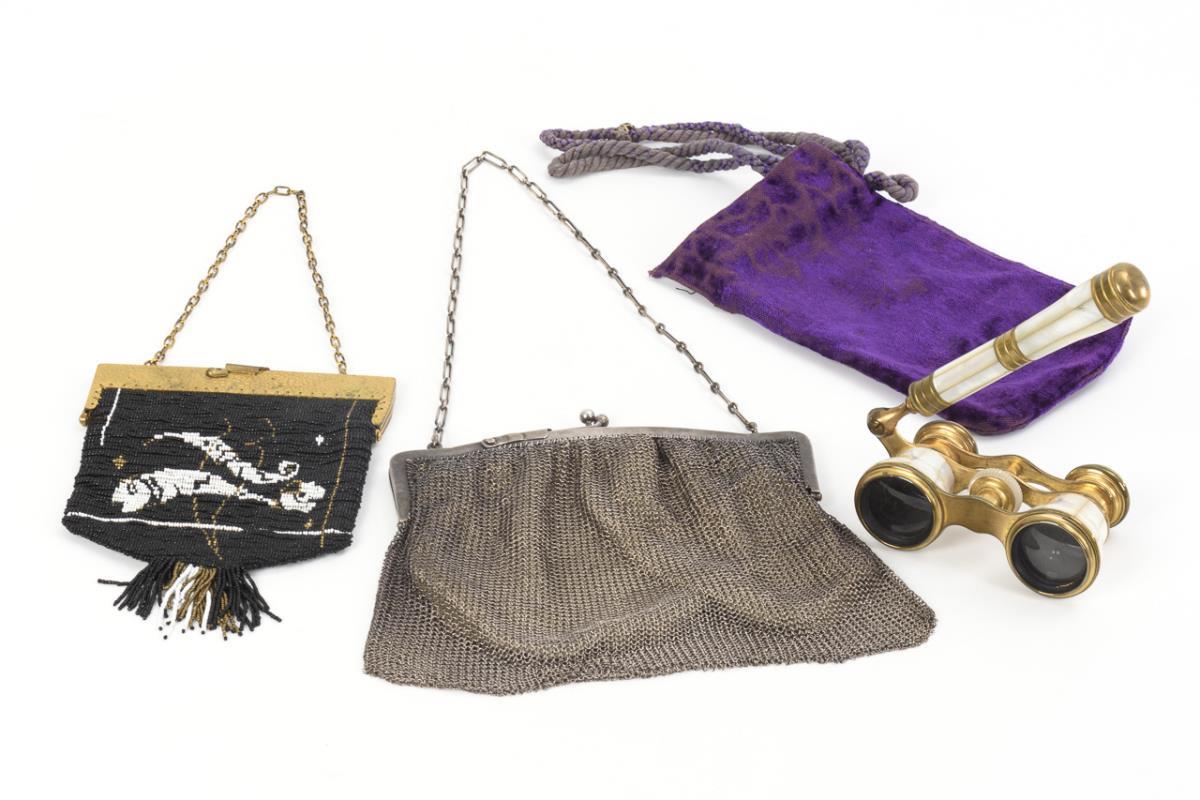 Messing-Opernglas mit Perlmutt. / Versilberte Kettentasche. / Tasche mit Perlenstickerei und Messingmontierung. / Violetter Samtbeutel mit Kordel. Beutel etwas zerschlissen, sonst kaum Alters-/Gebrauchsspuren.