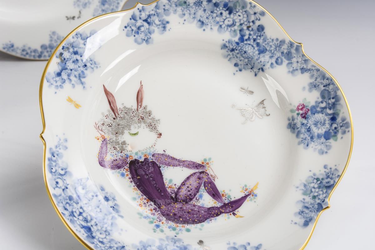 Form "Großer Ausschnitt". Umgeben von zarten blauen Blütenbändern bemalt mit Tiermotiven (Eule, Fuchs und Esel).