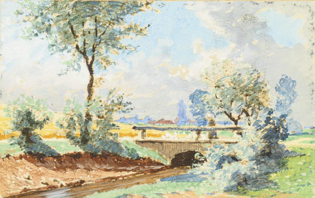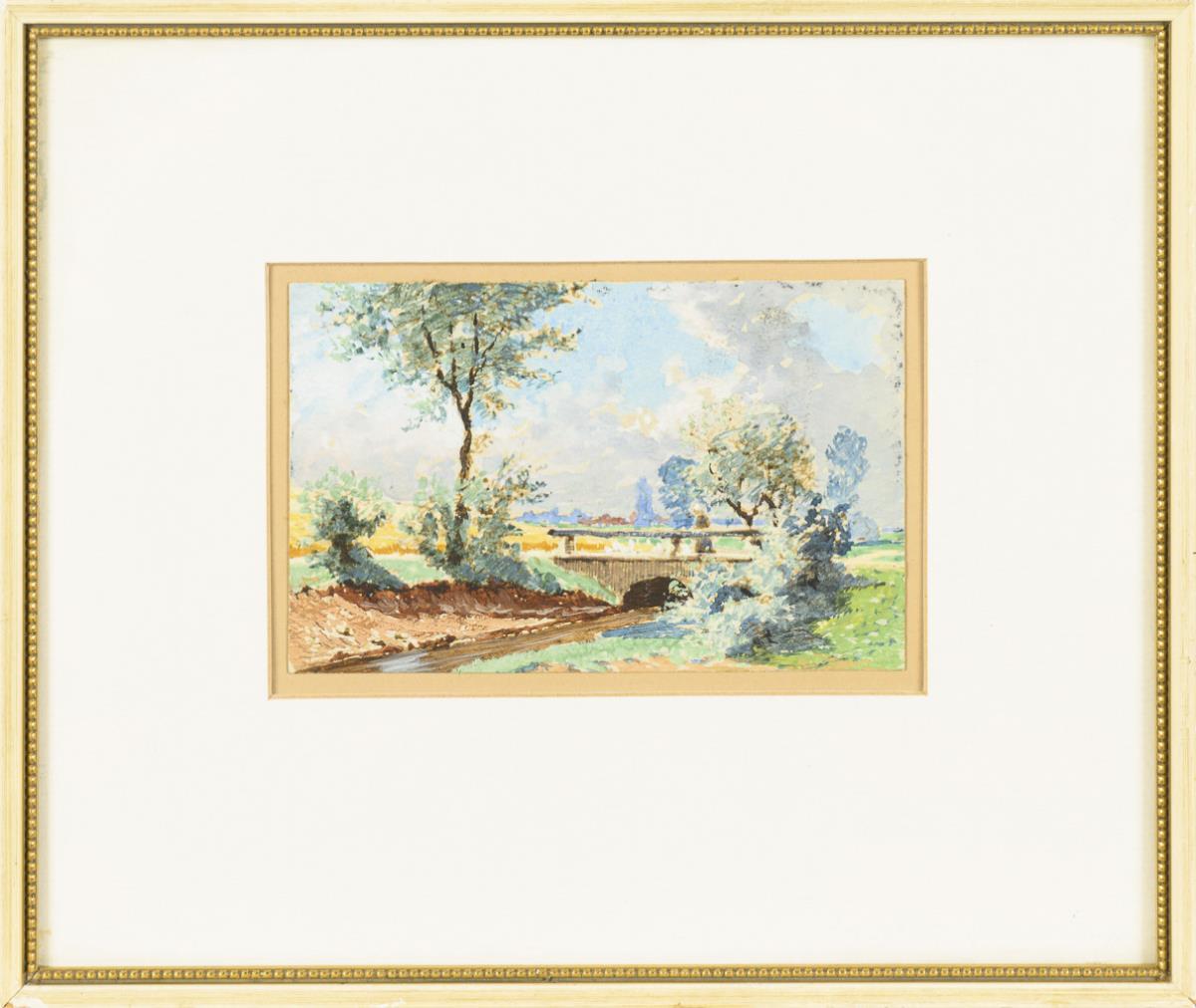 Qualitätvolle Bachlandschaft mit Brücke und Bäumen an einem Kornfeld im Sonnenschein.