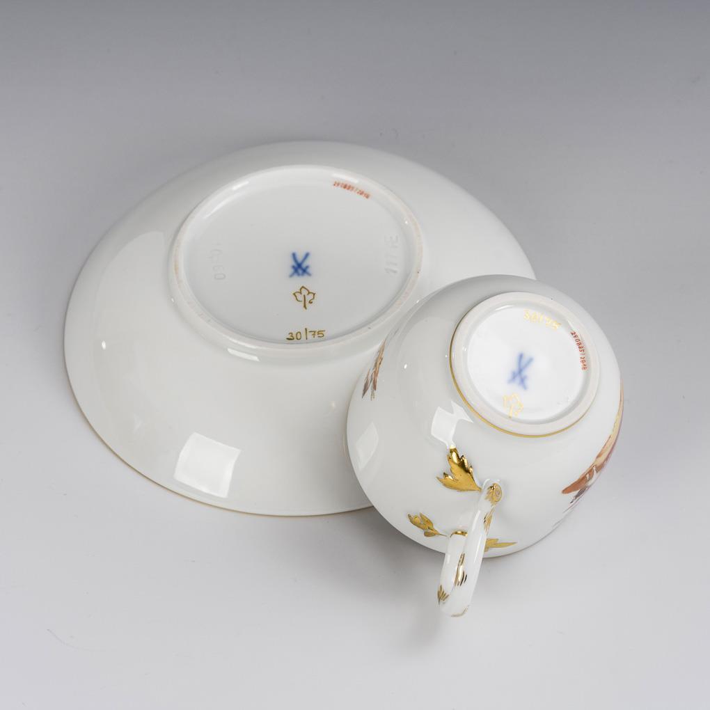 Polychrom bemalt, goldstaffiert. H Tasse 5,6 cm, Ø originale Untertasse 12,5 cm.