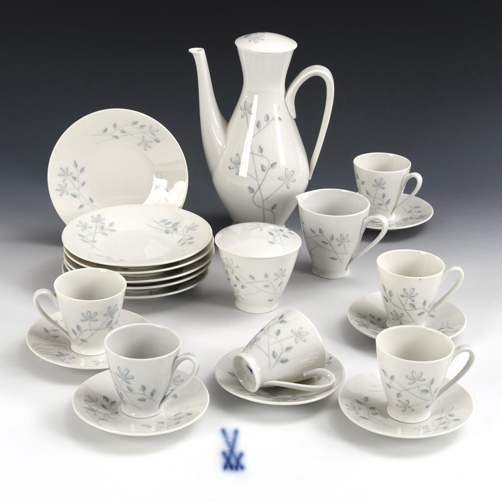 21 Teile. Form "Kollektivservice". Mit pastellfarbenen gemalten, stilisierten Blumenstängeln. Mokkakanne (H 21 cm), Milchkännchen, Zuckerdose, 6 Mokkatassen, 6 Untertassen und 6 Gebäckteller.