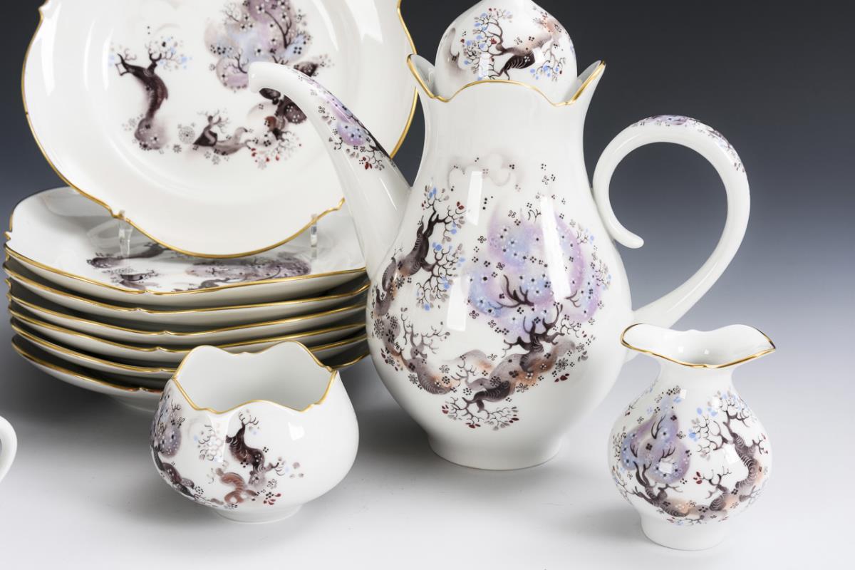 22 Teile. Form "Großer Ausschnitt". Mokkakanne (H 19,5 cm), Sahnegießer, Zuckerschale, 6 Mokkatassen, 6 Untertassen und 7 Kuchenteller.