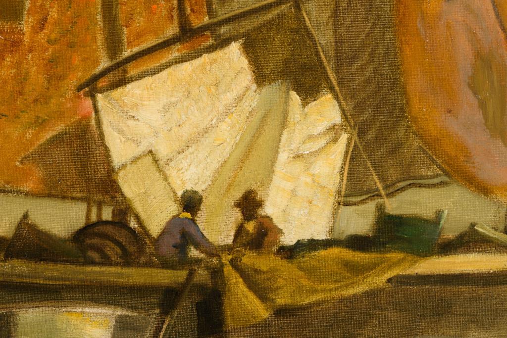 Fischer im Sonnenschein in den Booten nahe dem Ufer. Leichte Altersspuren.