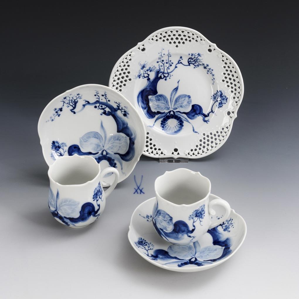 Durchbruchteller und 2 Kaffeetassen "Blaue Orchidee auf Ast". Meissen.