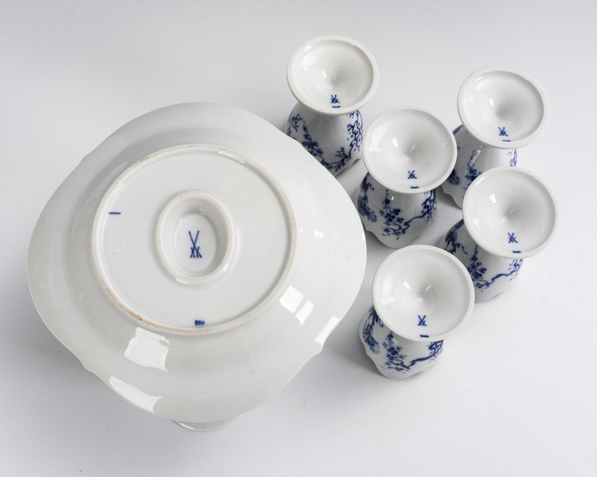 Sauciere und 5 Eierbecher "Blaue Orchidee auf Ast". Meissen.