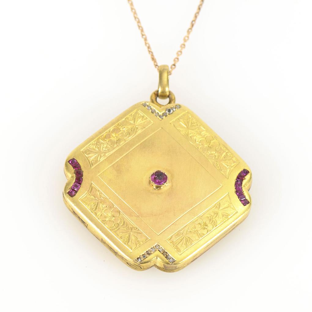 Großer, partiell gravierter Anhänger mit kleinen, eingelassenen Rubinen und Dimantrosen. 2 gerahmte Innenfächer. Ankerkette mit Ringfederschließe.