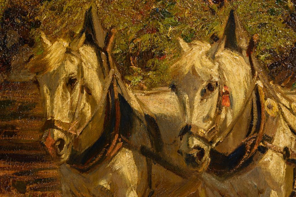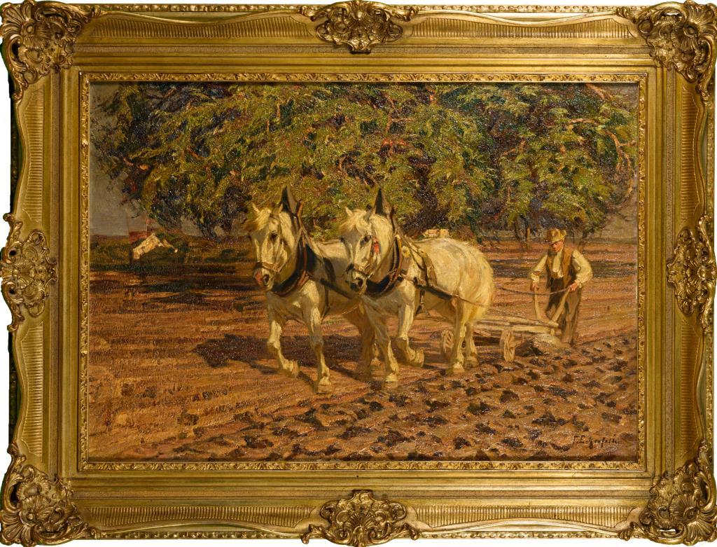 Der Bauer mit den Pferden bei tief stehender Sonne auf dem Feld.