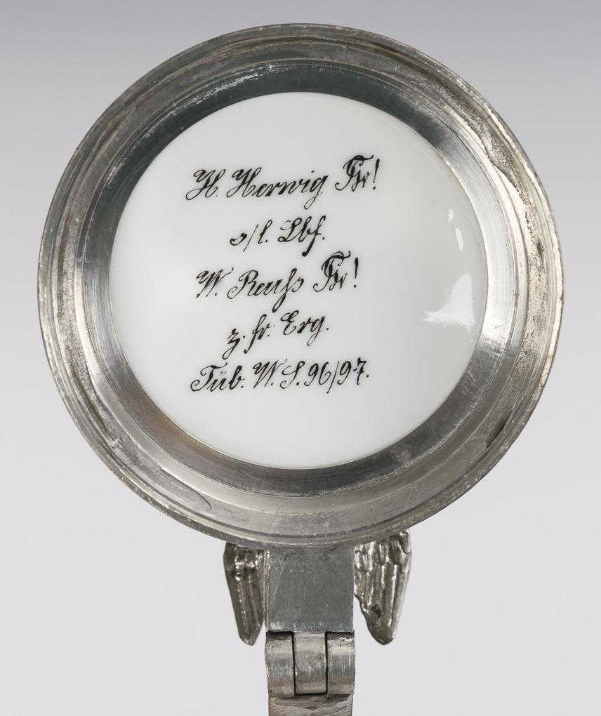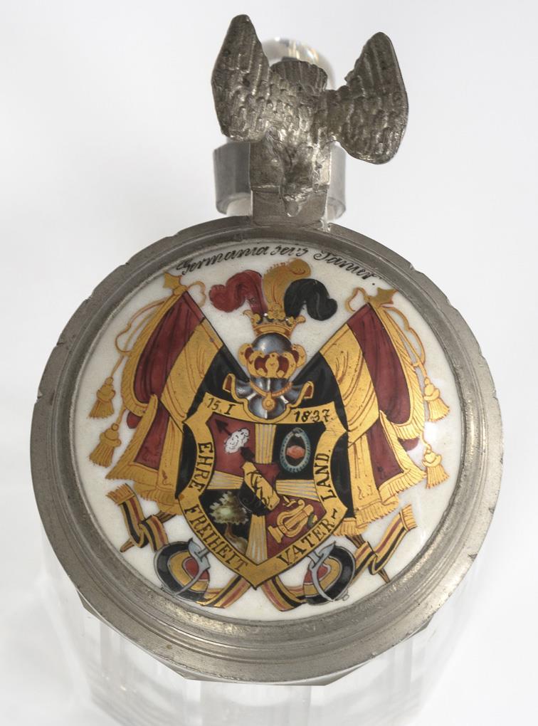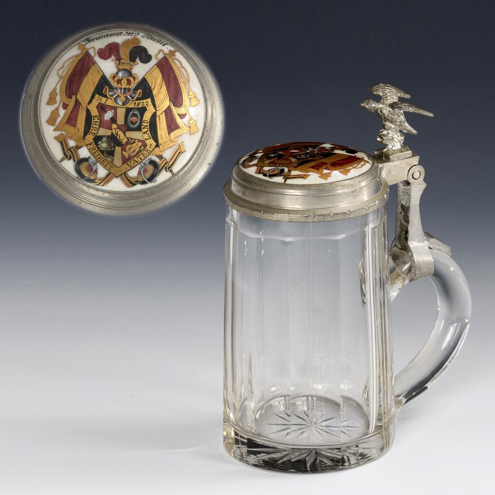 1/4-Literkrug aus farblosem Glas mit facettierter Wandung und Bodenstern. Montierter Zinndeckel mit Adlerdrücker und Porzellan. Gemaltes Germania-Verbindungswappen mit Panier und Wahlspruch; innen Widmung Tübingen 1896/97. Kerben am Deckelrand.