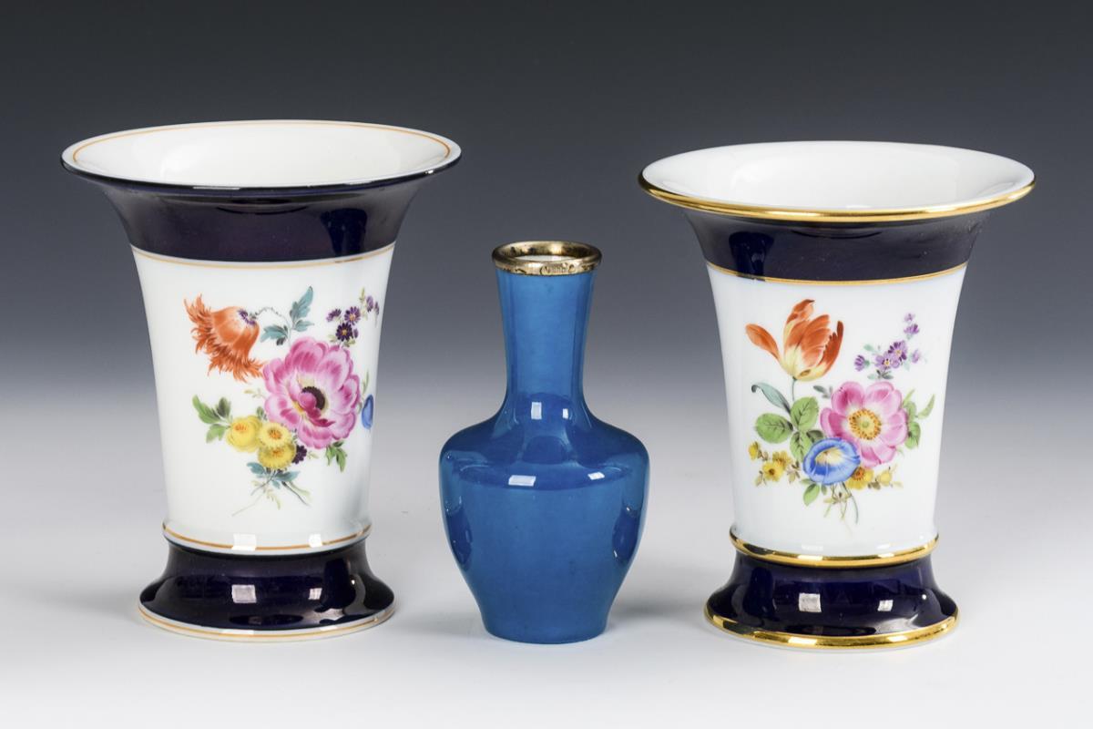 Paar Vasen mit Kobaltrand und Vase mit Silbermontierung. Meissen.