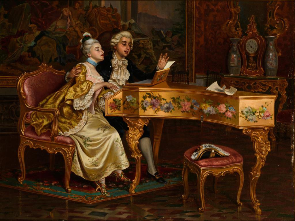 Rokoko-Musikstunde am Spinett mit singendem Adelspaar in herrschaftlichen Räumen. Eine kleine restaurierte Stelle mit Hinterklebung.