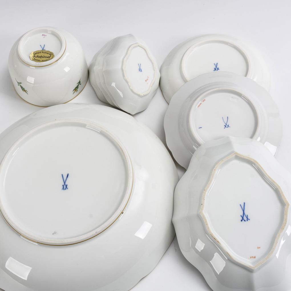 Schale (Ø 25 cm), 1+5 Ovalschälchen (L 1x 18 und 5x 10 cm), Zuckerdose (H 9,5 cm), 1 Untertasse (Ø 14 cm) und 1 kleiner Teller (Ø 14 cm). Haarriss in 1 Ovalschale.
