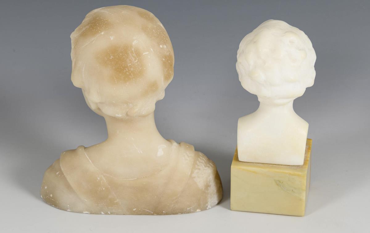 Je Alabaster, 1x evtl. Marmalyth, 1x beiger Marmor-Sockel. Je um 1900. Kleiner Kopf "Frederic" mit undeutlichem Zusatz bezeichnet, im Sockel Firmenplakette Schumacher/Osterode. H 14,5 bzw. 13,5 cm (mit Sockel).