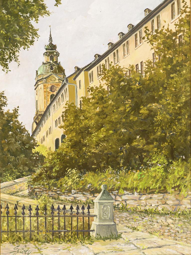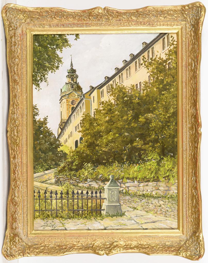 Blick vom Schlossaufgang zur Heidecksburg an einem sonnigen Tag | Nachtrag 5.6.2023: Der Maler ist Hans-Jörg Egidy (1916 - 2006).