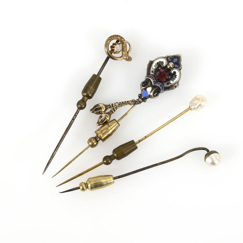 Biedermeier-Krawattennadel und 3 Krawattennadeln um 1900.