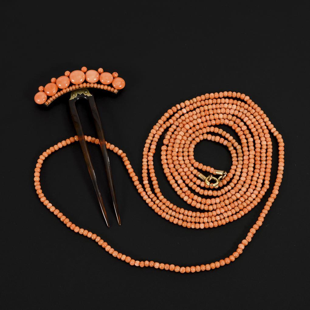 Lange Korallenkette und Haarkamm um 1900.