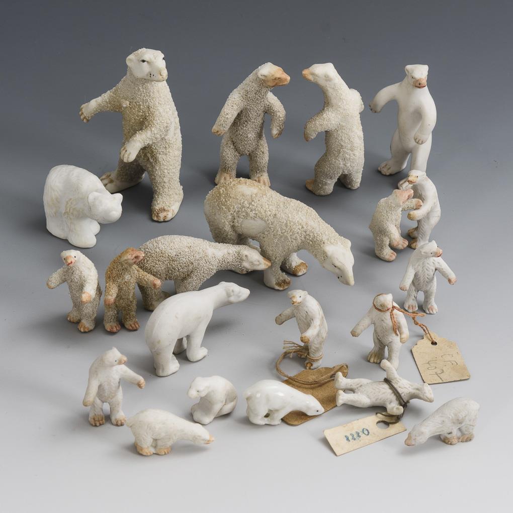 21 Miniaturfiguren als Eisbären. Porzellanfabrik Freitag, Großbreitenbach.