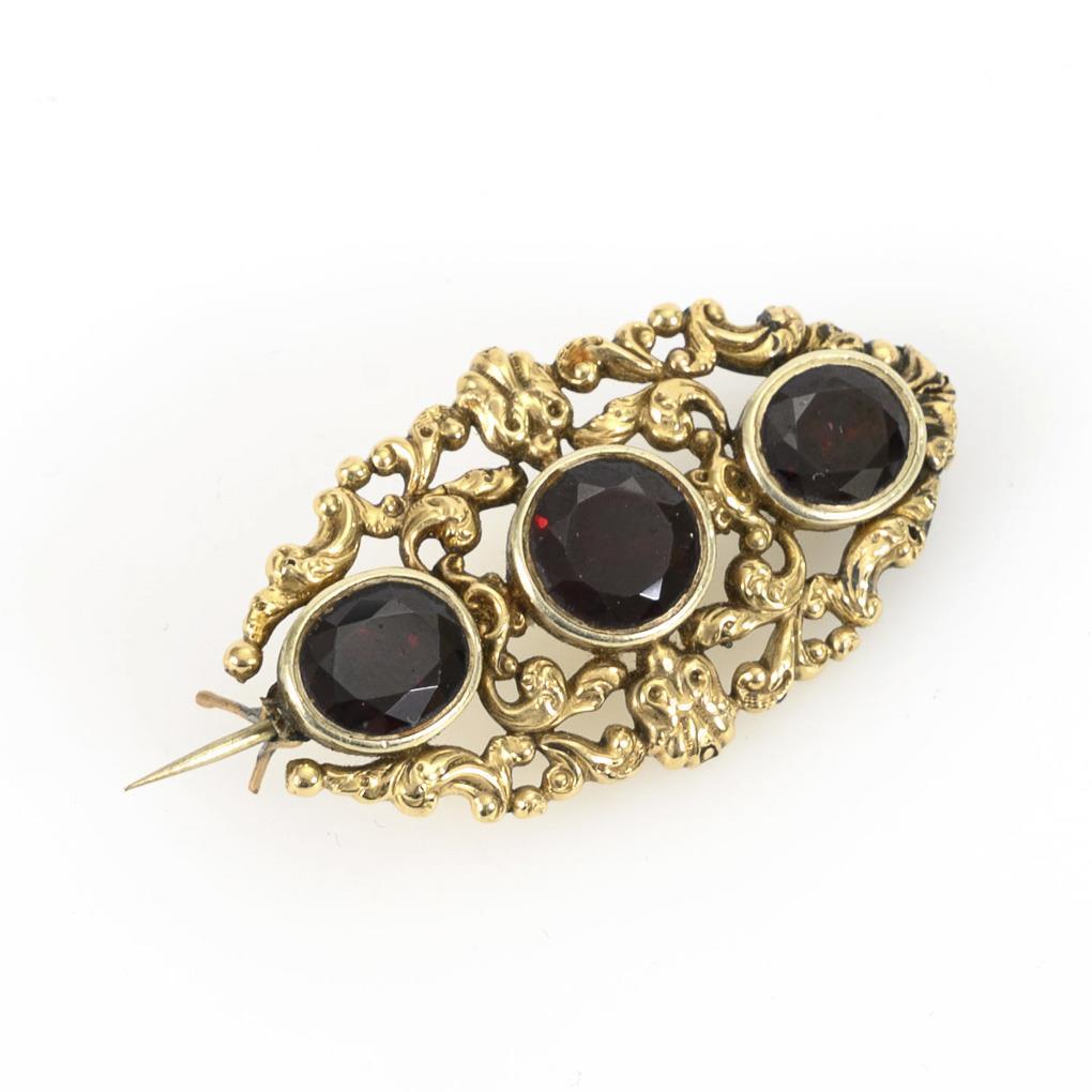 In Hohlform reliefierte Ornamentbrosche mit 3 zargengefassten Granaten. Geschlossene Rückseite. Kipphakenverschluss. Reparaturstelle an Broschierung.
