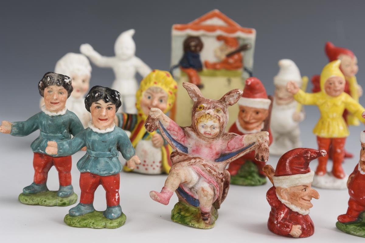 Verschiedene Figürchen, darunter 4 Kasper, 2 Elfen, 2 weiße Figuren und Kaspertheater mit "Punch & Judy".