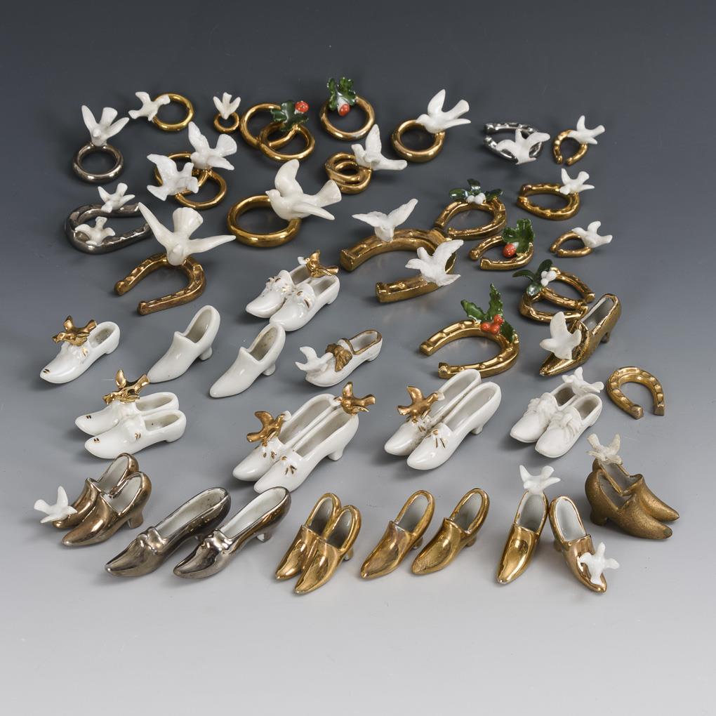 40x "Glücksnippes": 21x Täubchen auf Ringen bzw. Hufeisen und 19x Schuhe als Einzelschuhe oder Paare mit Täubchen. Nach Familienüberlieferung wurde ein Teil dieser Dekorations-Figürchen durch einen Konditor in Wellington geordert. Kleine Defekte.