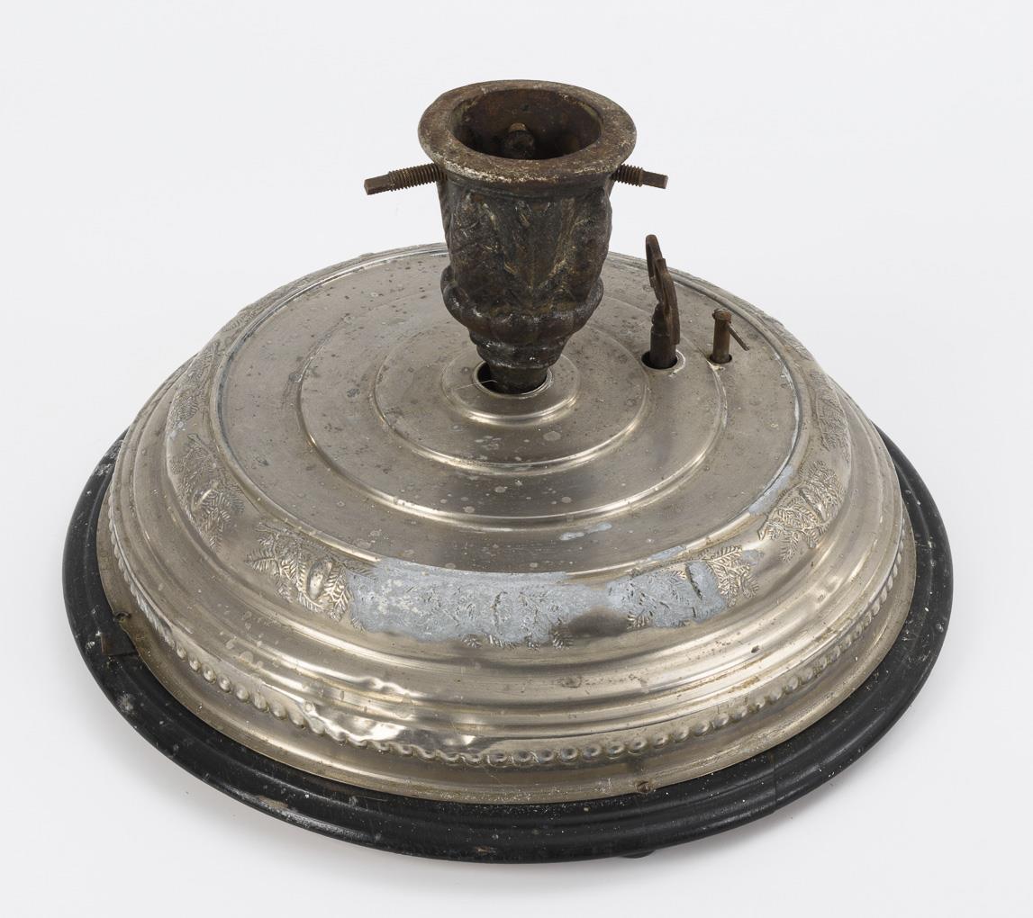 Ebonisiertes Holz, geprägtes Nickelblech, Gusseisen lackiert. H 21 cm, Ø 39 cm.