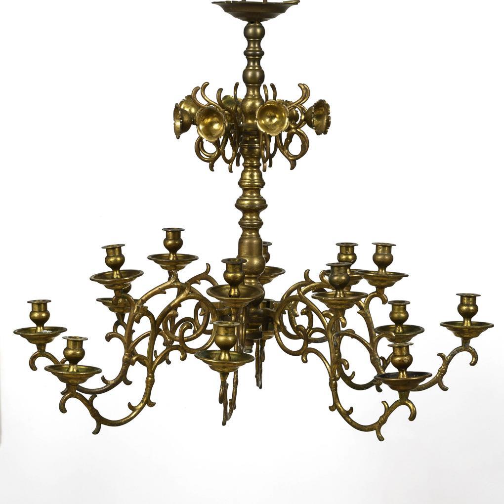 Flämische Krone mit reich profiliertem Balusterschaft, 8 eingesteckten Voluten-Armen mit je 2 Vasentüllen über Tropfschalen sowie obere Galerie mit blütenförmigen Reflektoren an 8 Rocaillen-Armen. Abschlusskugel fehlt, 1 Tüllengewinde defekt, Bohrlöcher von entfernter Elektrifizierung, Zaponierung berieben.