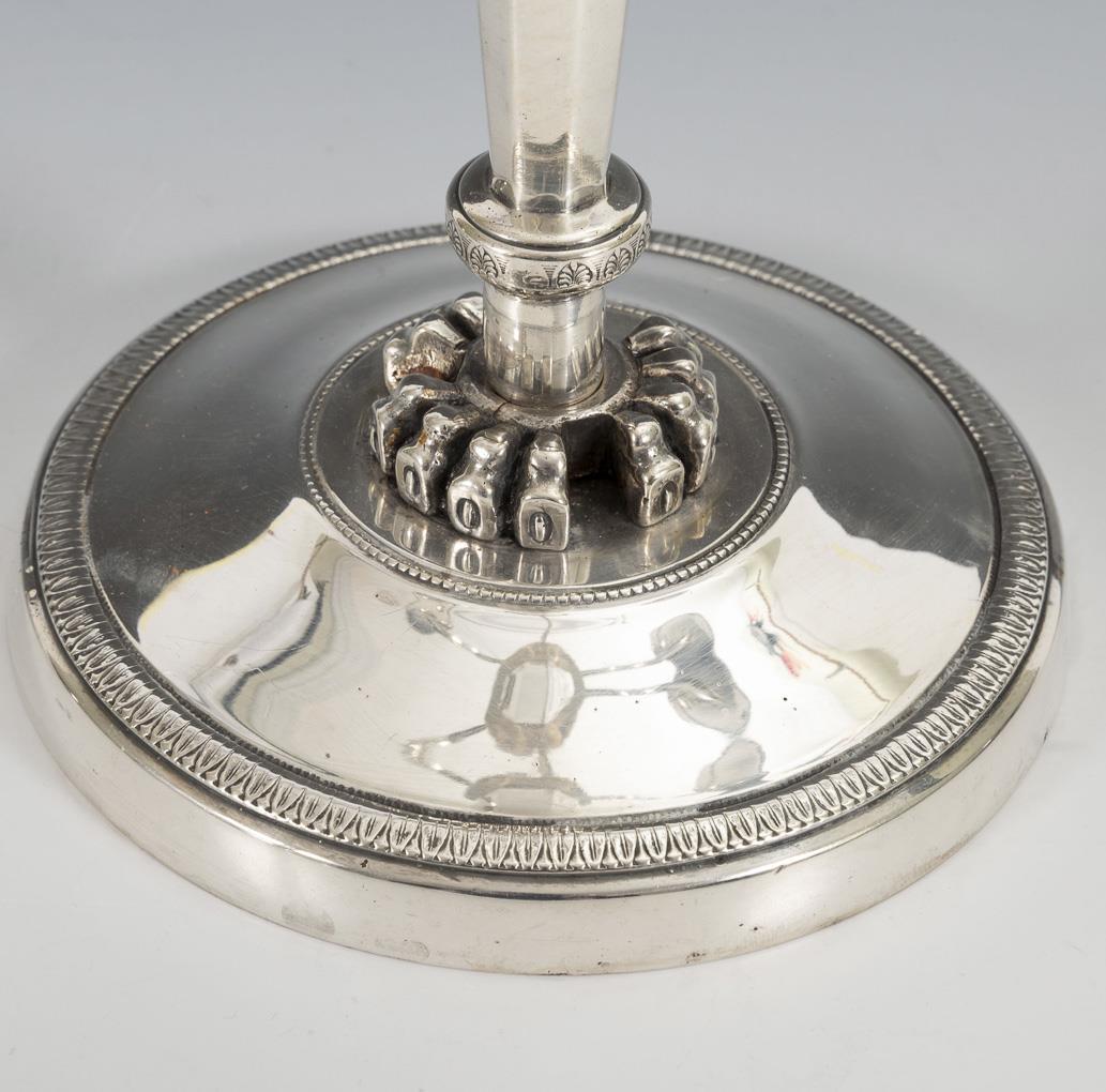 5-flammige Kandelaber in neoklassizistischer Form. Aufsatz abnehmbar und als 1-flammige Leuchter nutzbar. Starke Gebrauchsspuren, kleine Lötstellen.
