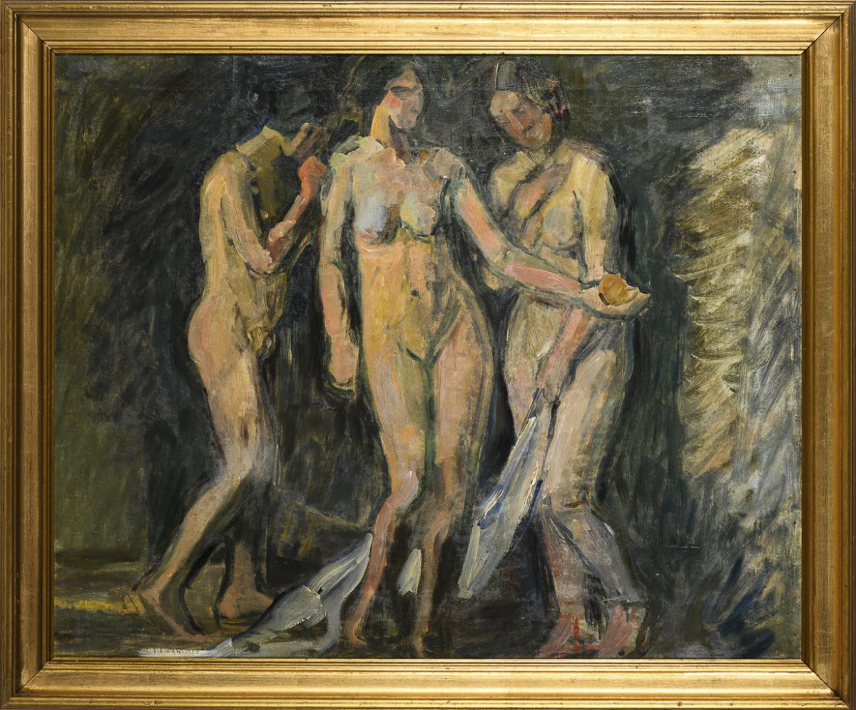 Drei nackte Frauen in hellem Licht vor dunklem Hintergrund.