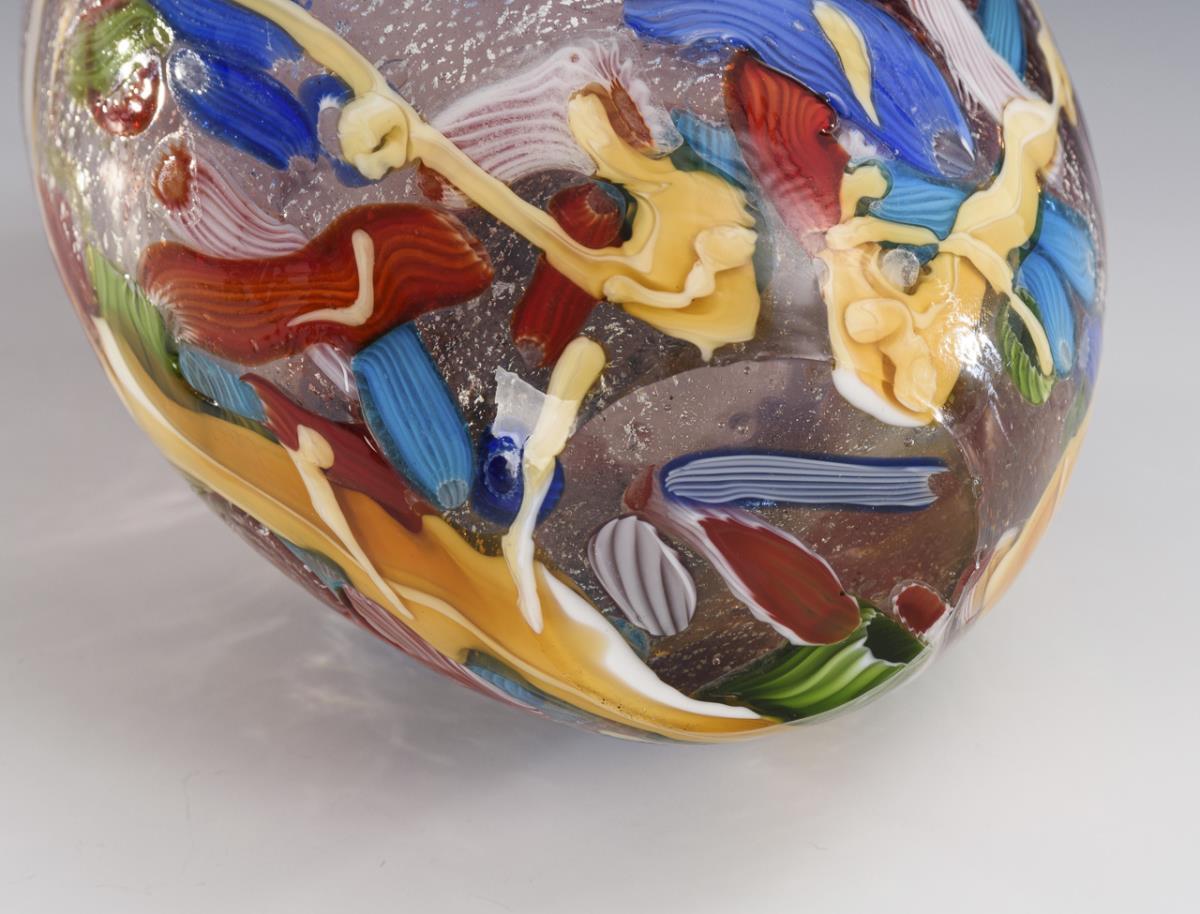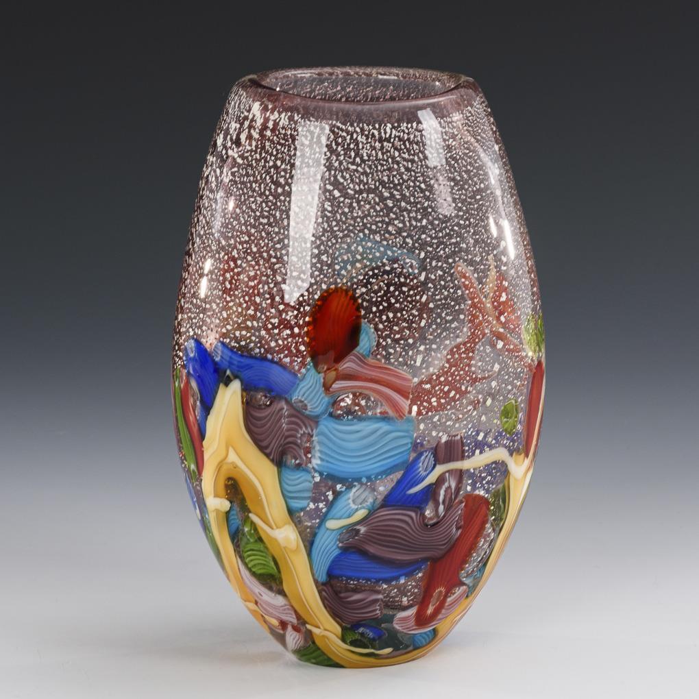 Farbloses Glas, mit schwachviolettem Glas überfangen, in der Zwischenschicht eingeschmolzene, gesprengte Silberfolie und bunte Murrinen. H 19,5 cm.