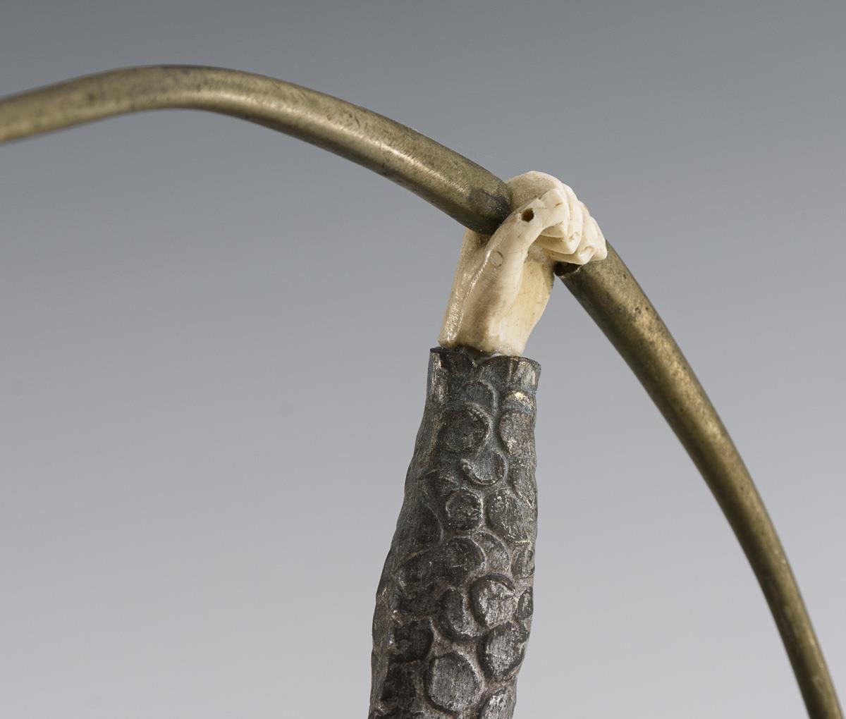 Régule, silber- und goldbronziert, Elfenbein-Imitat, schwarzer Marmor-Sockel. Bezeichnet. H 18 cm (ohne Bogen), gesamt 25 x 19 x 6,5 cm.