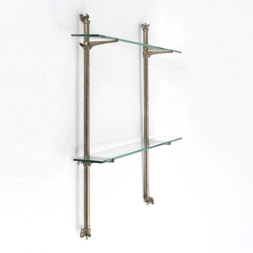 Schlichtes 2-Etagen-Glasregal mit Metallrahmen aus 2 Rundstäben mit höhenverstellbaren Ablage-Halterungen durch Flügelschrauben. Leichte Alters-/Gebrauchsspuren, Gestell mit leichten Korrosionsspuren.