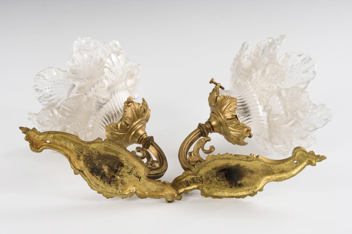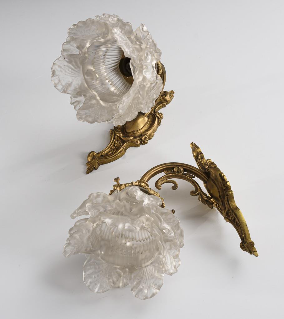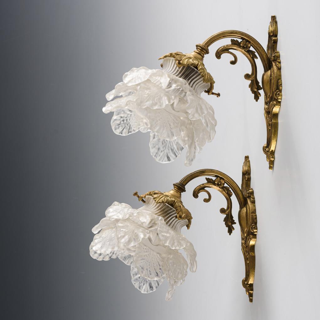 Im Stil des Rokoko gestaltete Wandhalterungen mit rocaillenbesetztem Arm und Bajonettfassung im blütenförmigen Glasschirm. Funktion nicht geprüft. 1 kleiner Spannungsriss im Glas.