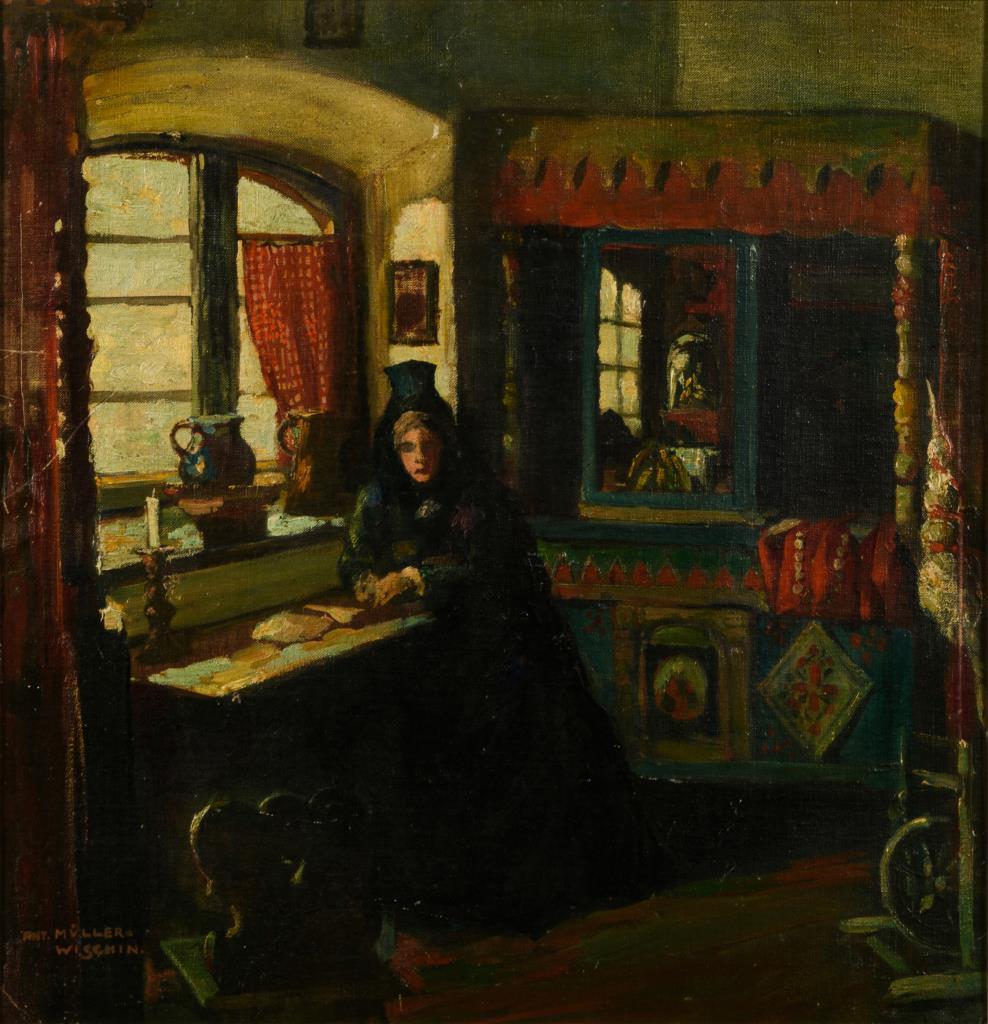 Junge Frau in Tracht in der Stube am Fenster nahe des Bettes.