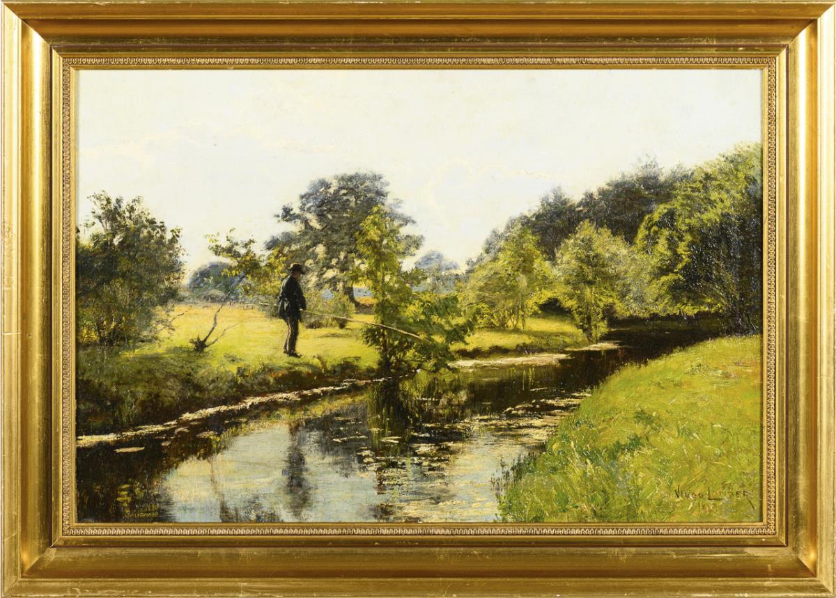 Sonnige Sommerlandschaft mit dem Angler am gemächlich fließenden Gewässer. Leinwand teils randdoubliert.