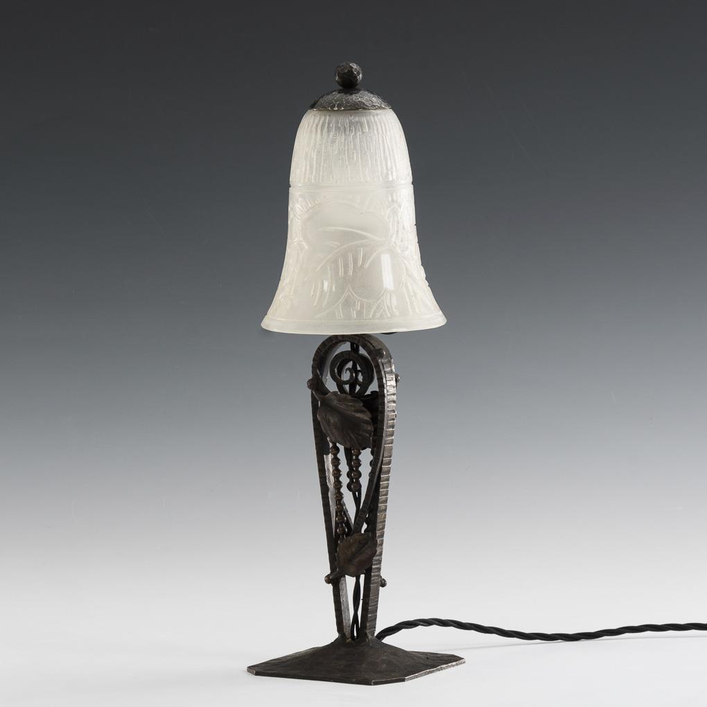 Brüniertes Schmiedeeisen, farbloses Glas mit geätztem Dekor außen, innen mattiert. H 35 cm.