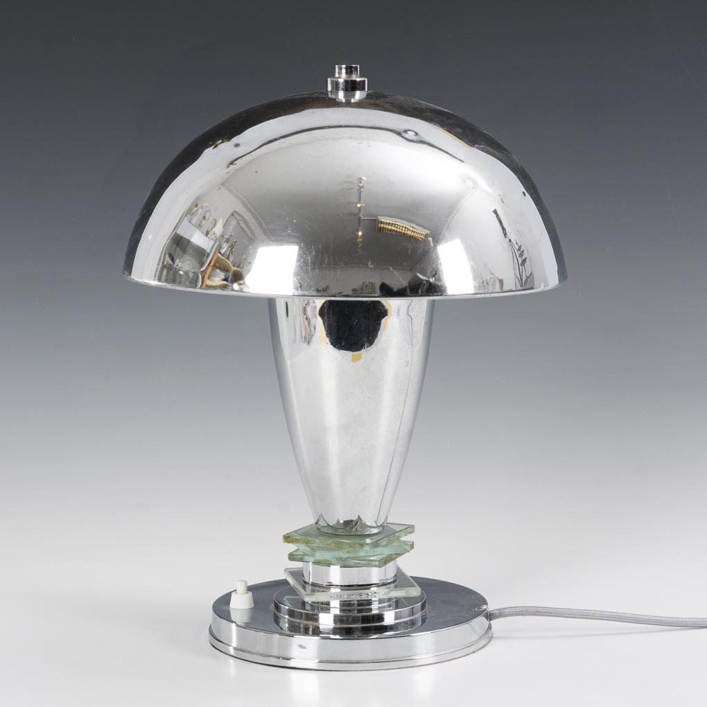Futuristische Lampe in Pilzform mit quadratischen Glasscheiben am Schaftansatz sowie 2 Bajonettfassungen. Etwas verbeult.