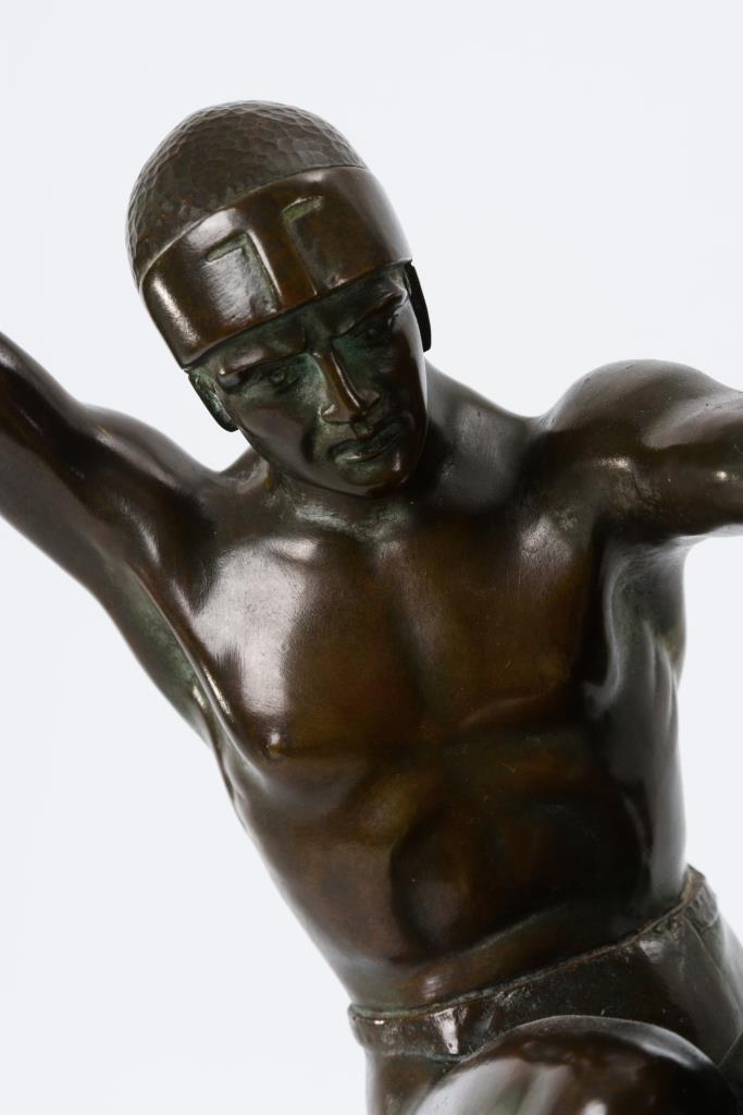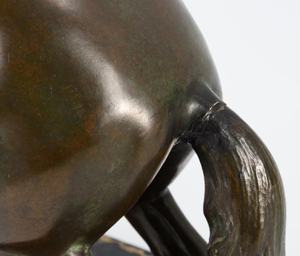 Bronze patiniert mit grünem Schimmer, schwarze Marmor-Plinthe.Auf der Plinthe bezeichnet.H 60 cm, gesamt 64 x 55 x 33 cm.