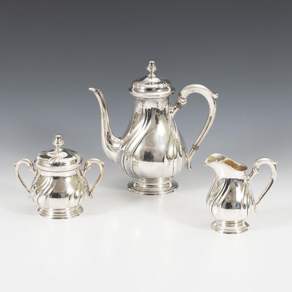 Bauchig-godronierte Form: Kaffeekanne, Zuckerdose und Sahnekännchen. Kleine Delle am Scharnierdeckel der Kaffeekanne.