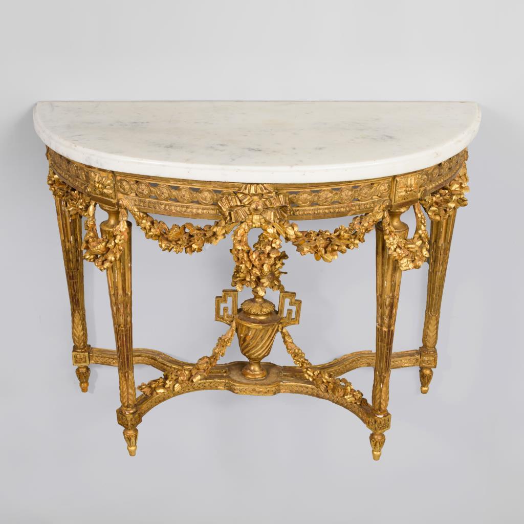 Klassizistische Prunk-Konsole mit weißer Marmorplatte, reich verziert mit floralen Flachschnitzereien, vollplastischen Festons und einer Amphore. Marmorplatte ergänzt, Alters-/Gebrauchsspuren.