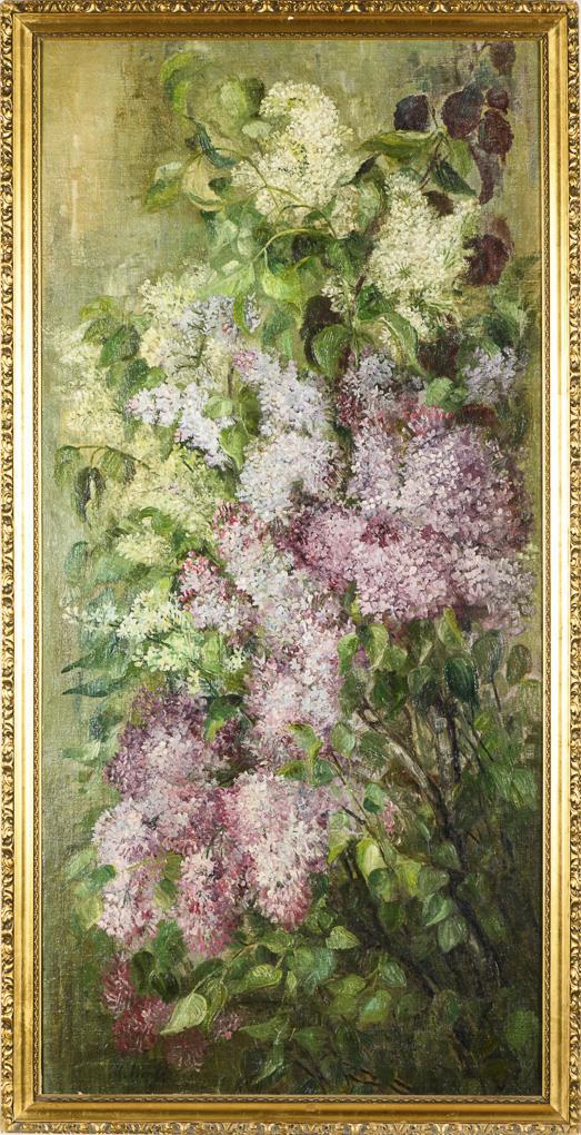 Großes Stillleben mit weißem und lilafarbenem Flieder vor neutralem Hintergrund. Minimale Altersspuren.