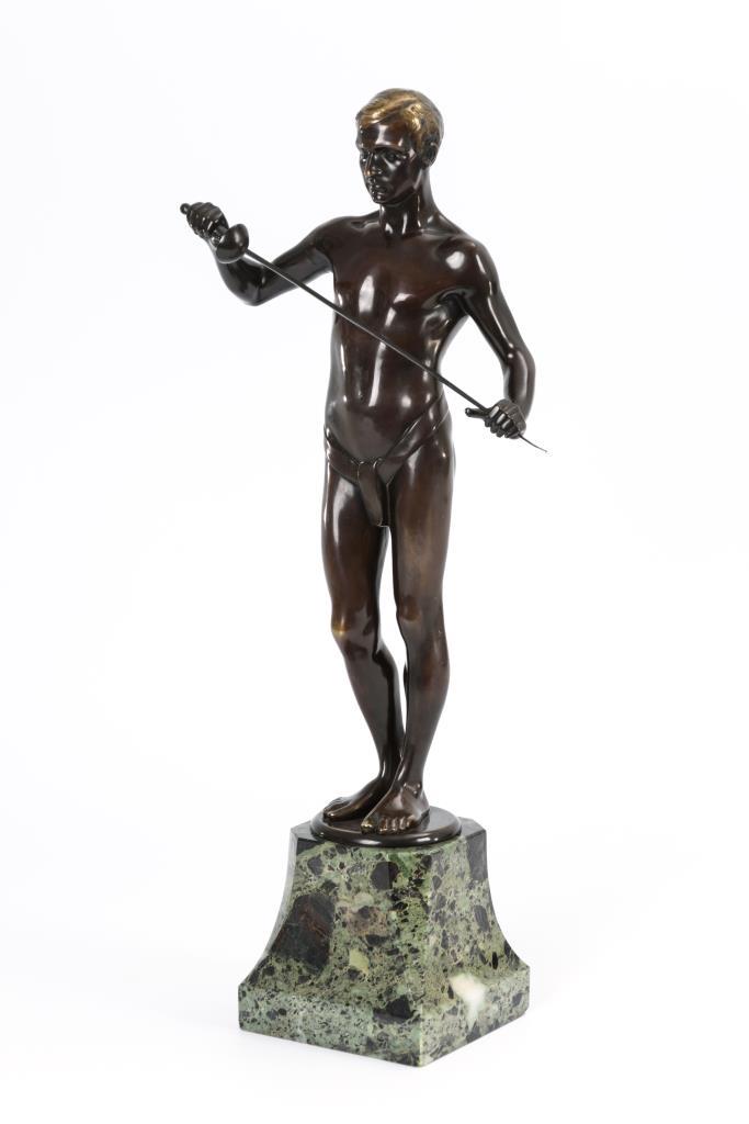 Lediglich mit einem schmalen Hüfttuch bekleideter Jüngling mit Degen. Degenspitze verbogen, Patina teils etwas berieben.